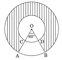 17. In the given figure, two concentric circles with centre O have radii 21 cm and 42 cm. If ∠AOB = 60°, find the area of the shaded region. [Use π = 22/7]