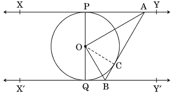 25. In the given figure, XY and X'Y' are two parallel tangents to a circle with centre O and another tangent AB with point of contact C, is intersecting XY at A and X'Y' at B. Prove that ∠AOB = 90°.