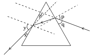 In this diagram, the angle of incidence, the angle of emergence and the angle of deviation respectively have been represented by