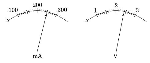 27. The current flowing through a resistor connected in a circuit and the potential difference developed across its ends are as shown in the diagram by milliammeter and voltmeter readings respectively:
