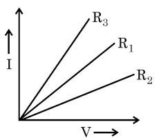 7. A student plots V-I graphs for three samples of nichrome wire with resistances R1, R2 and R3. Choose from the following the statement that holds true for this graph.