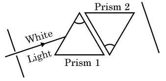 (c) Complete the path of white light when it passes through two identical prisms placed as shown :