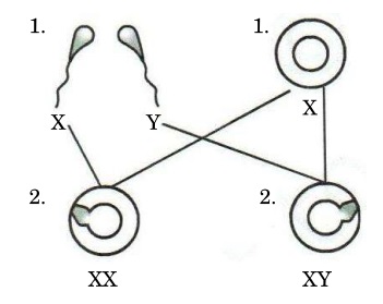 25. (a) Label (1) and (2) in the given diagram showing sex determination in human beings.