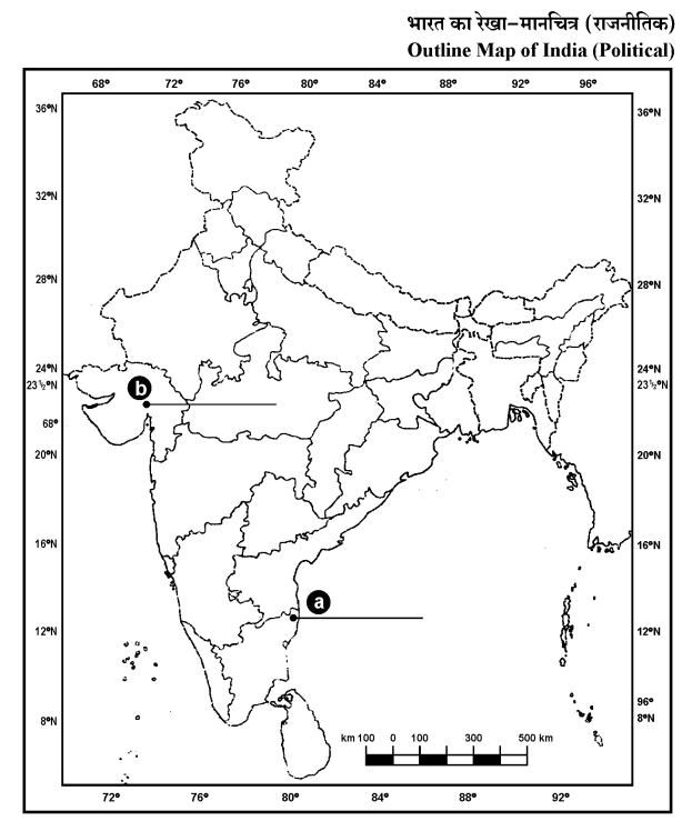26. (A) Two features a and b are marked on the given political outline map of India. Identify these features with the help of the following information and write their correct names on the lines marked near them :