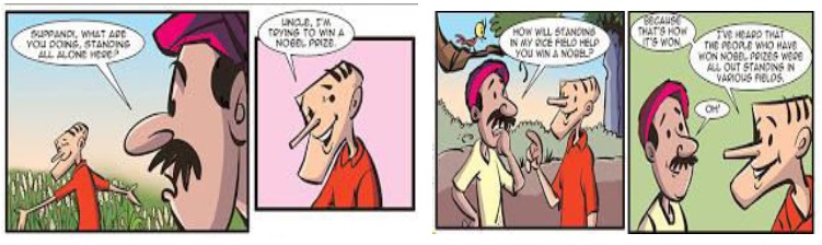 I saw Supanddi standing in the field. When I -(i)- doing there, he -(ii)- he was trying to win a Nobel prize. I was confused and enquired how standing in the rice field would help him do so. He stumped me by saying that he -(iii)- won Nobel prizes had all been outstanding in their fields!