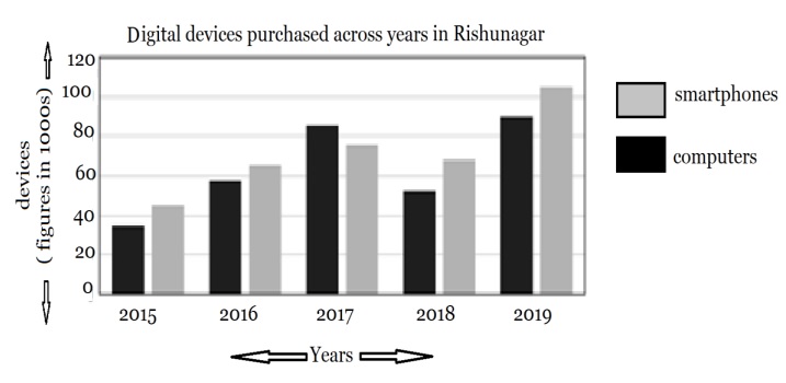 (A) The chart below displays data about the number of digital devices purchased in Rishunagar across the years 2015-2019. Write a paragraph analyzing the given data.