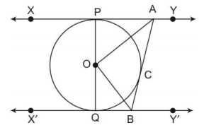 18. In given figure XY and X'Y' are two parallel tangents to a circle with centre O and another tangent AB with point of contact C intersecting XY at A and X' Y' at B. Prove that ∠AOB = 90°.