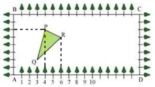 18. Class X students of a secondary school in Krishnagar have been allotted a rectangular plot of a land for gardening activity. Saplings of Gulmohar are planted on the boundary at a distance of 1m from each other. There is a triangular grassy lawn in the plot as shown in the fig. The students are to sow seeds of flowering plants on the remaining area of the plot.