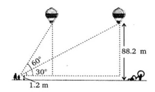 A 1.2 m tall girl spots a balloon moving with the wind in a horizontal line at a height 88.2 m from the ground. The angle of elevation of the balloon from the eyes of the girl at any instant is 60°.After sometime, the angle of elevation reduces 30°.Find the distance travelled by the balloon during the interval.