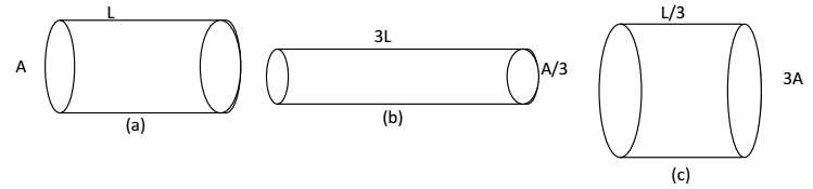 13. The figure below shows three cylindrical copper conductors along with their face areas and lengths. Compare the resistance and the resistivity of the three conductors. Justify your answer.