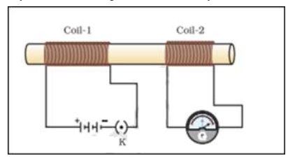 (ii) Two circular coils-1 and coil-2 are kept close to each other as shown in the diagram.Coil-1 is connected to a battery and key and coil-2 with a galvanometer. State your observation in the galvanometer: