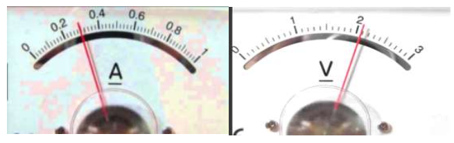 26. The current flowing through a resistor connected in an electrical circuit and the potential difference developed across its ends are shown in the given ammeter and voltmeter. Find the least count of the voltmeter and ammeter .What is the voltage and the current across the given resistor?