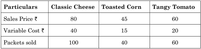 32. ‘Flavouright Foods Ltd.’ started a business of making nachos (corn chips) in three variants, Classic Cheese, Toasted Corn and Tangy Tomato. To start with, all the three variants will be sold in a standard packing of 100 gms each, the selling price would differ due to the ingredients used. Fixed costs are ₹ 38,000