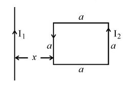 (b) A square loop of side ‘a’ carrying a current I2 is kept at distance x from an infinitely long straight wire carrying a current I1 as shown in the figure. Obtain the expression for the resultant force acting on the loop.