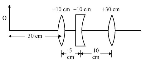 (b) Three lenses of focal lengths +10 cm, –10 cm and +30 cm are arranged coaxially as in the figure given below. Find the position of the final image formed by the combination.